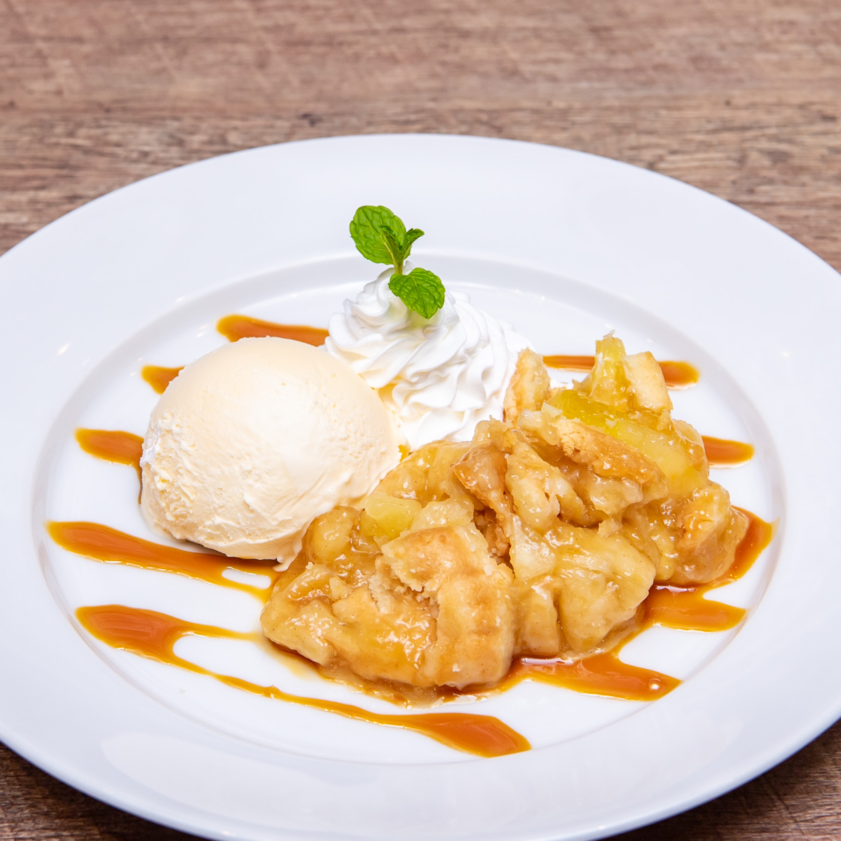 生クリームを添え、キャラメルソースでデコレーション。