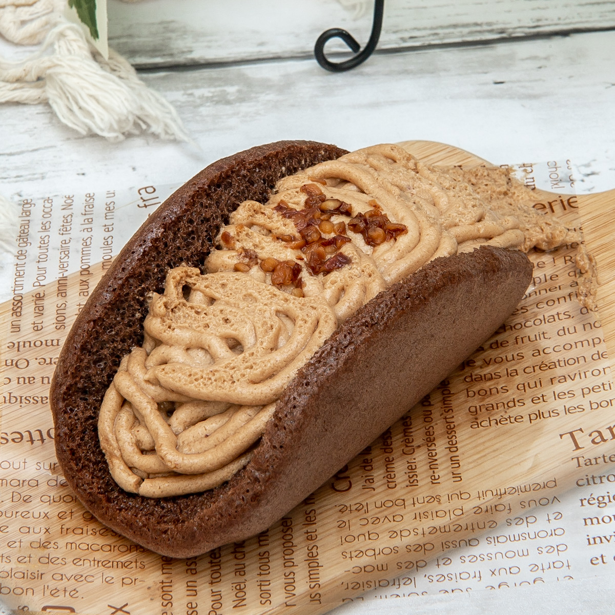 ふわっふわで口どけのよいココアオムレット生地で、イタリア栗のマロンペースト、モンブランクリームとホイップクリームを贅沢に包み込んだスイーツ。