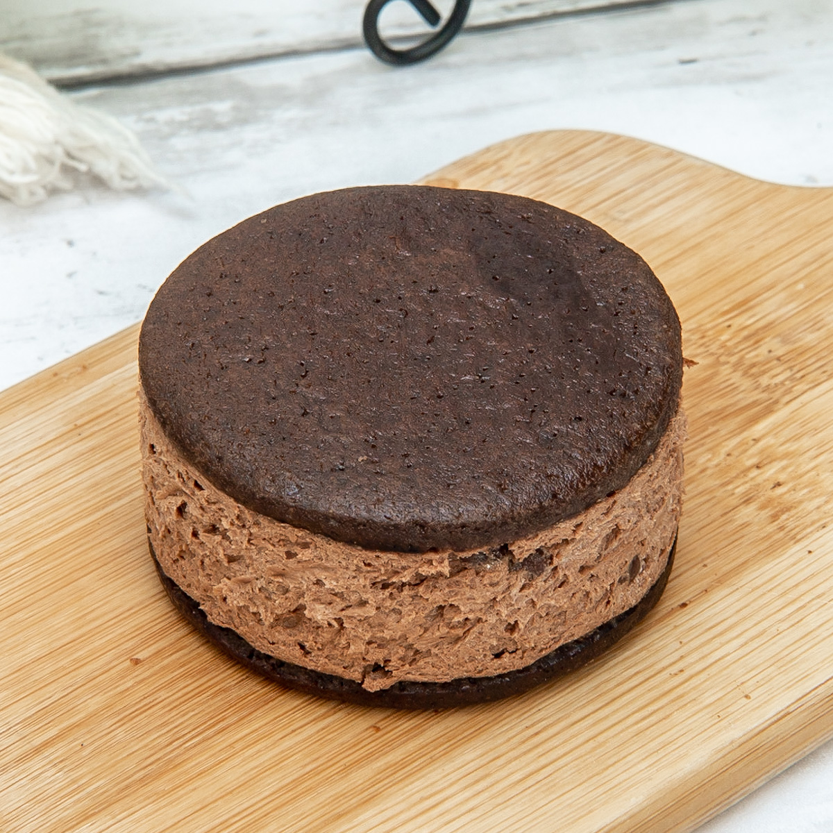 ココア味のビスケット生地に、チョコチップを混ぜ込み食感にアクセントを付けたクリームをサンド。