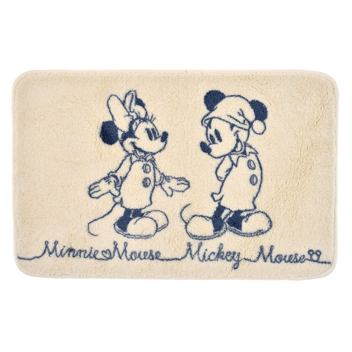 角をおとした優しい印象のスクエア型マットに、パジャマ姿の愛らしい「ミッキーマウス」と「ミニーマウス」、ネームロゴがプリントされています。