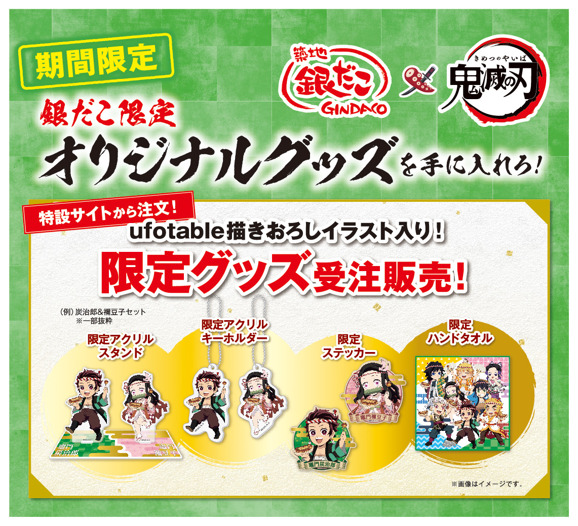 オリジナルグッズは、期間中に特設サイトのみで予約(=購入)することができ、受付終了後、予約(=購入)された数量のみを完全受注生産で製作する「築地銀だこ × 鬼滅の刃ファン」のための “唯一無二” の特別な商品です!