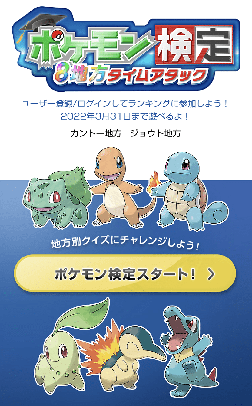 特設サイトにて「ポケットモンスター」シリーズで冒険する8地方にまつわるクイズに挑戦できる「ポケモン検定」