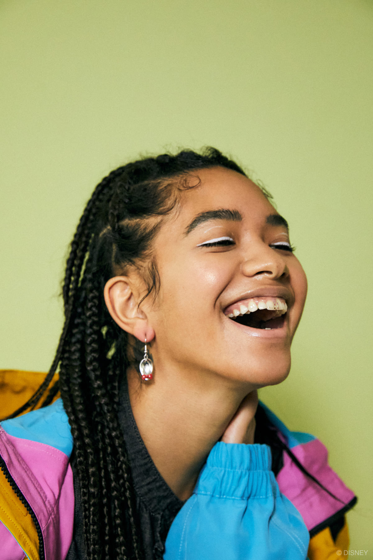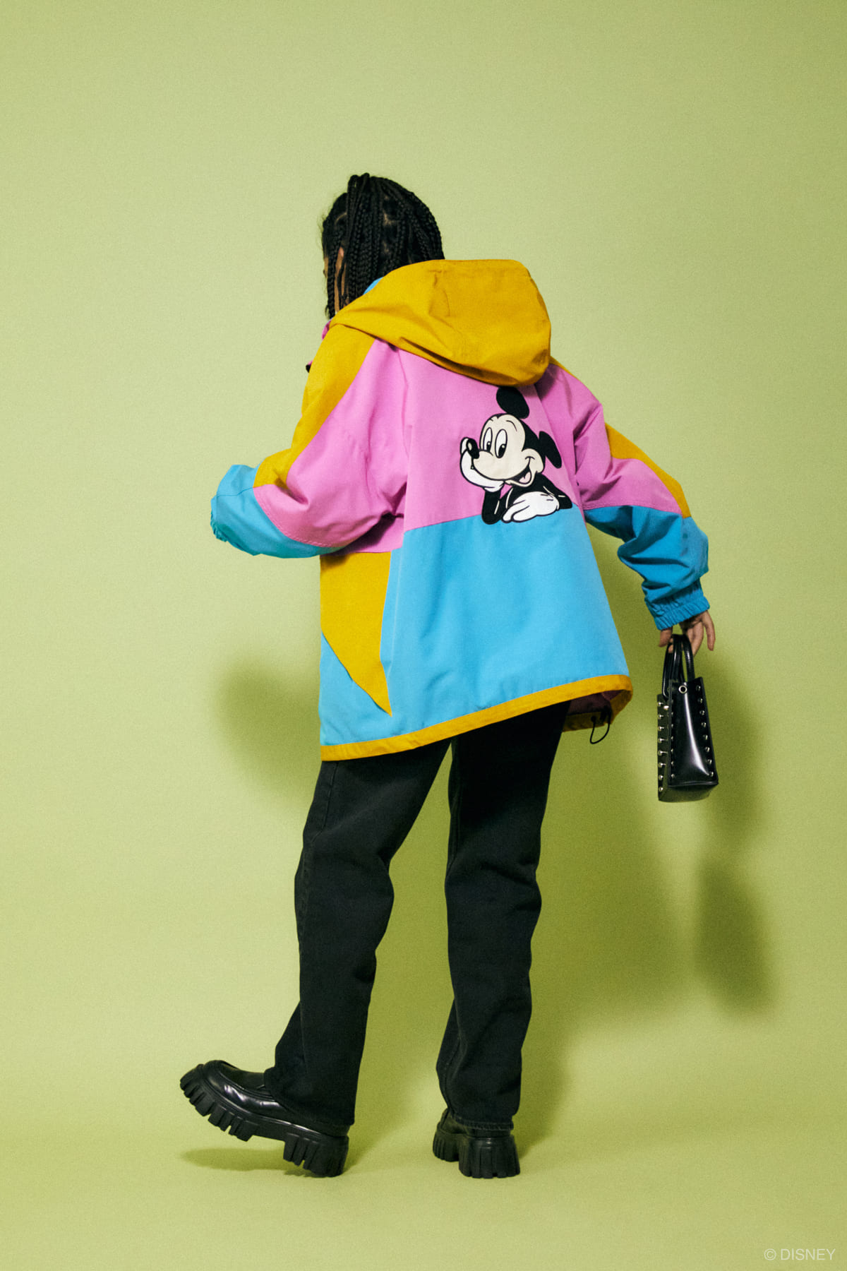 ポップなカラーのアウターは、背中の「ミッキーマウス」が大胆なデザイン。