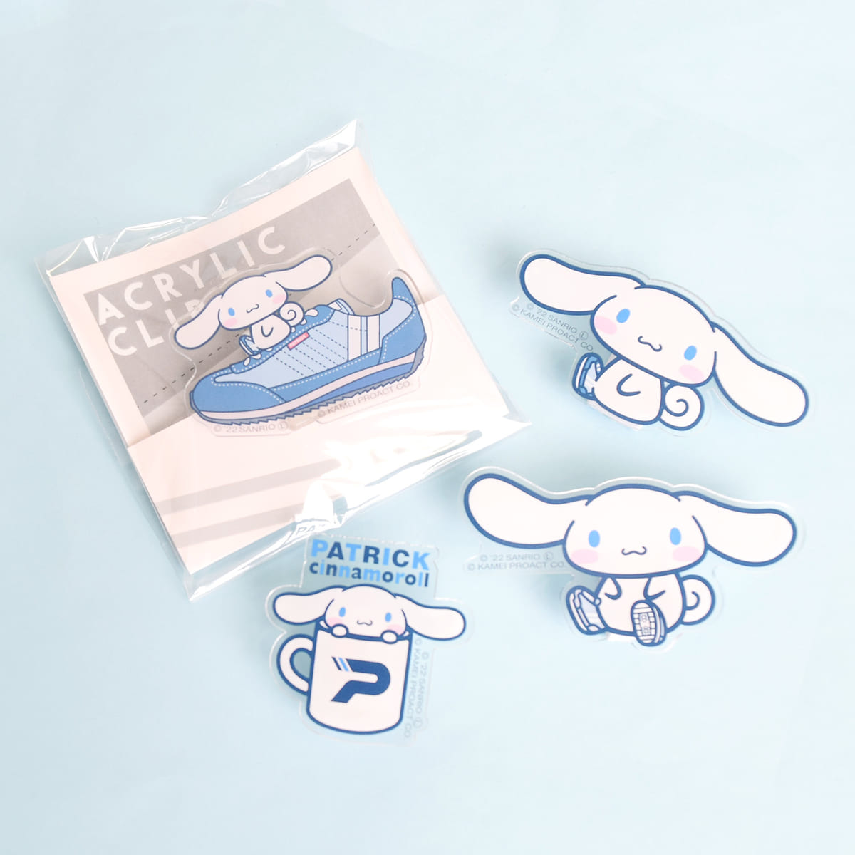 スニーカー姿の「シナモロール」と、パトリックのロゴの付いたマグから顔を出す「シナモロール」のアクリルスタンド。