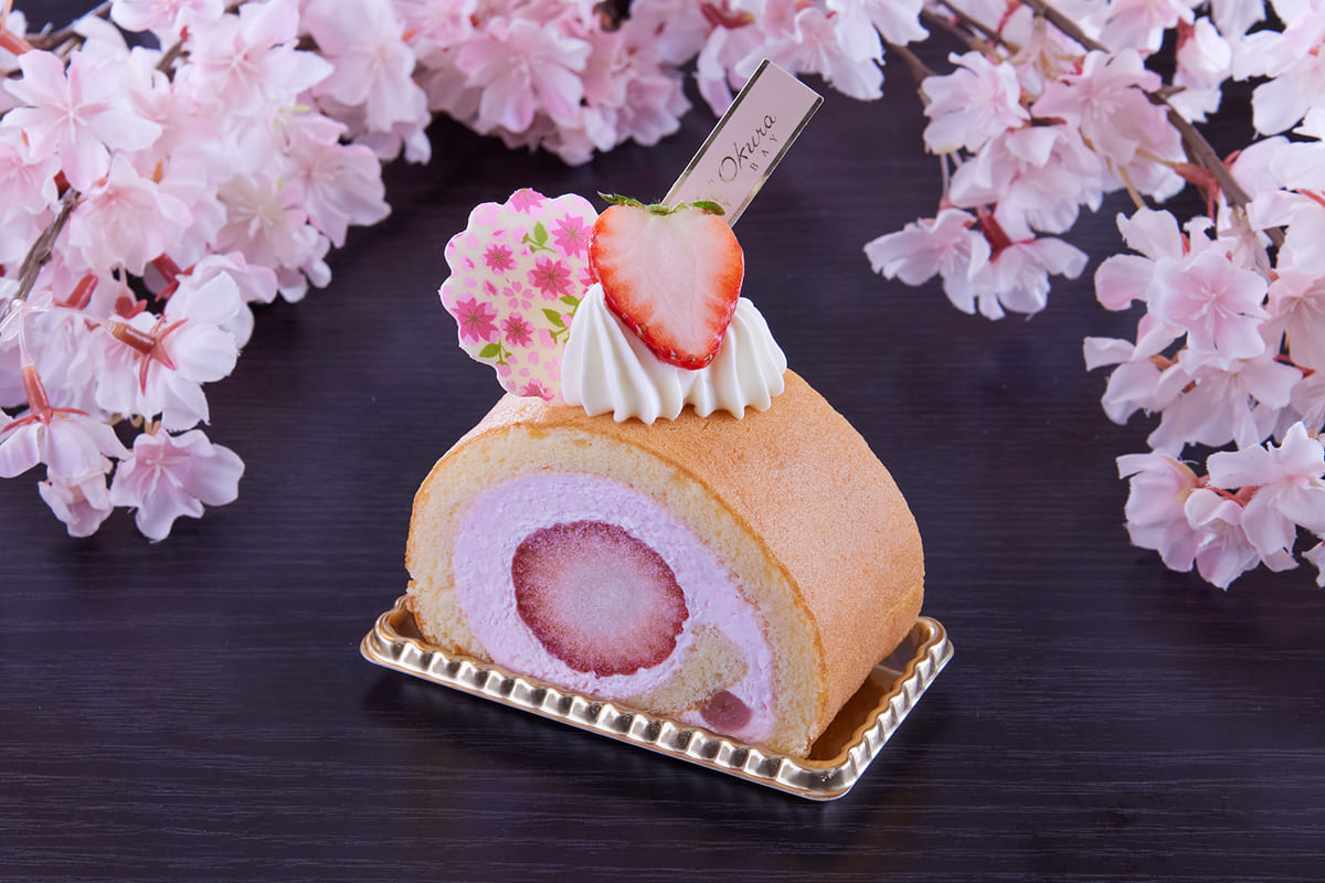 ふわふわの生地に桜風味の生クリームと桜餡を巻き上げたロールケーキ。
