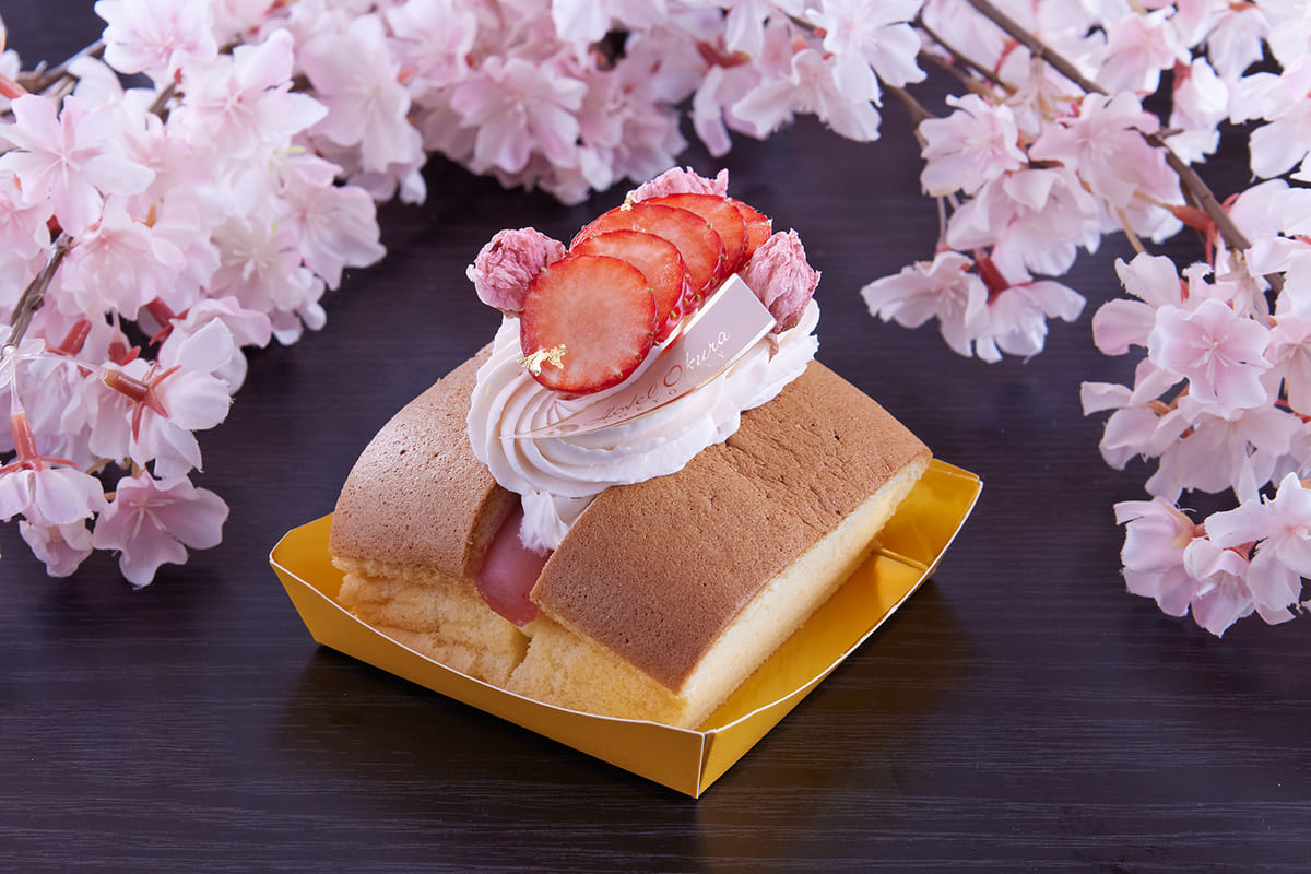 桜餡、自家製カスタードクリームと生クリームを挟み込み、桜の花といちごをトッピングしたスイーツです。