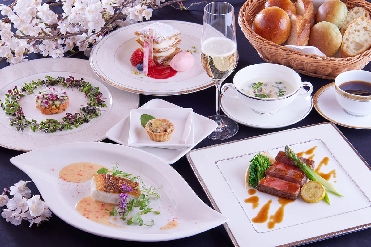 サーモントラウトのマリネ ガトー仕立てや、アサリと春野菜のクリームスープ、真鯛のポワレ 桜色のバターソースなど、桜の美しい季節にピッタリなメニュー。
