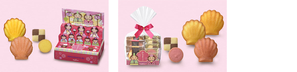ひな壇デザインのBOXに焼菓子をアソートしたプチギフトなど、用途でさまざまに選べるスイーツがラインナップ。