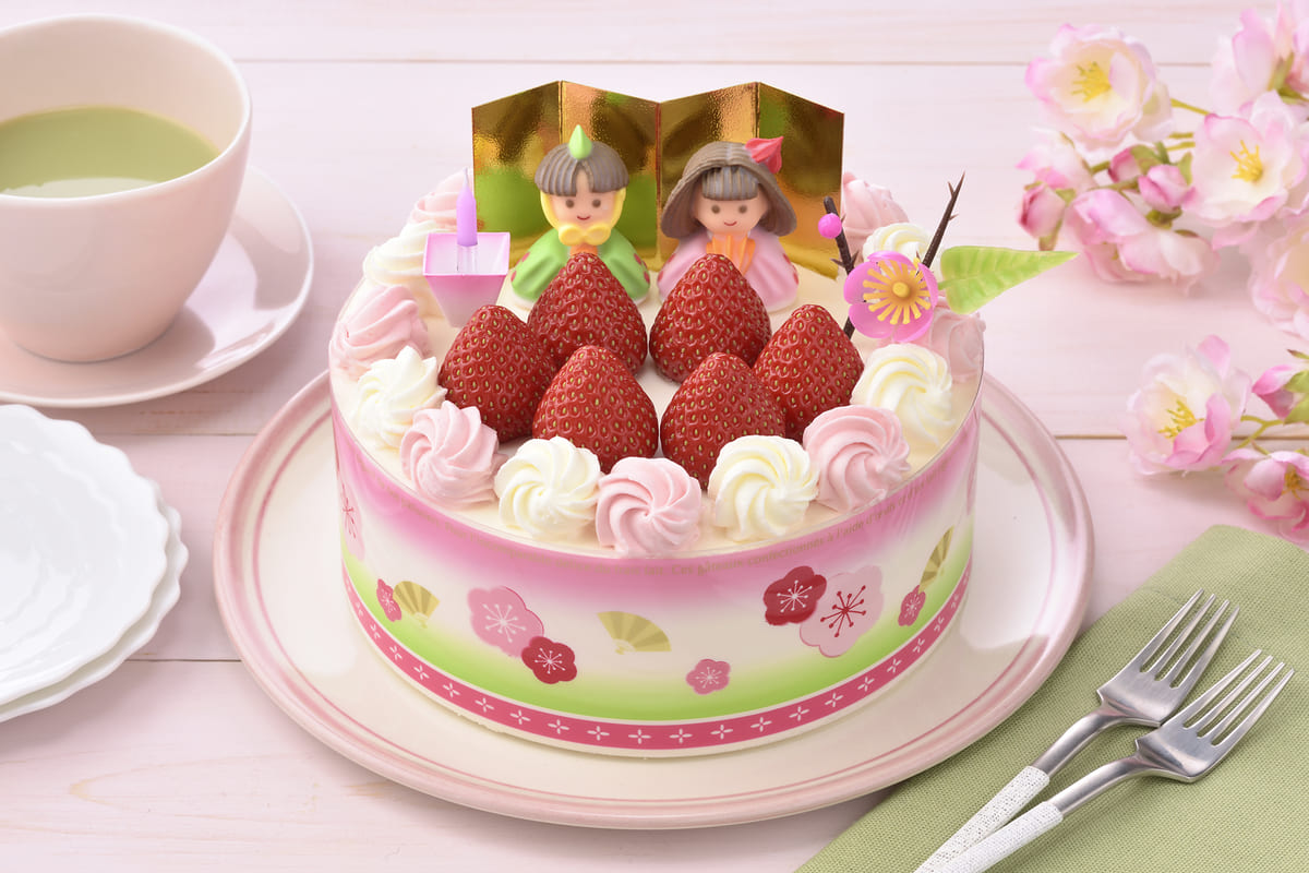 おひなさまとおだいりさまのお人形や、ホワイトとピンクのホイップクリームがかわいらしいショートケーキです。