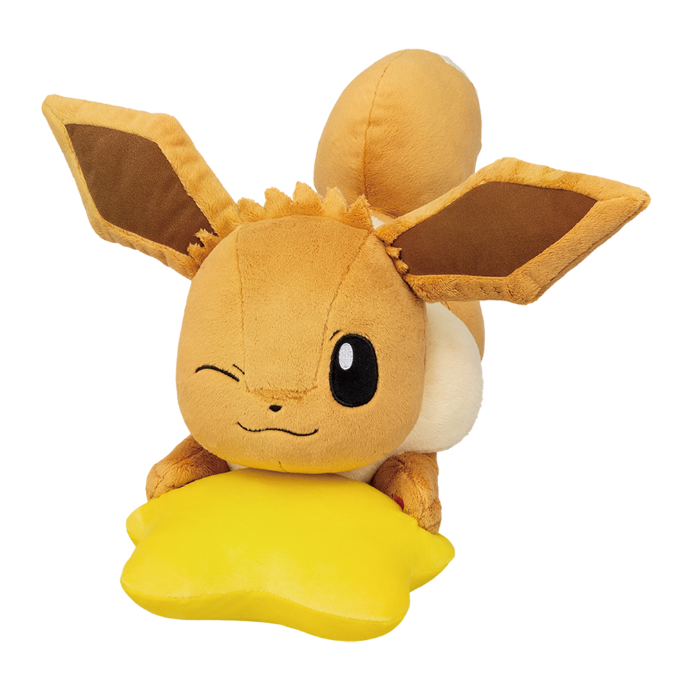 B賞に用意される、お星さまに飛びついているようなポーズが可愛い、イーブイのぬいぐるみ。