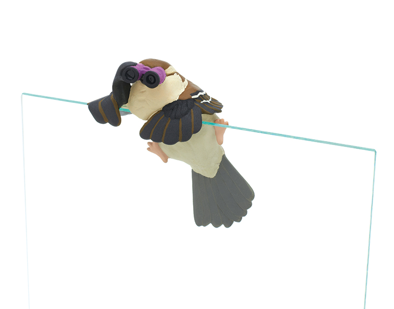 街なかで見かける可愛い姿から一変、クールに標的を狙うスズメのフィギュア。