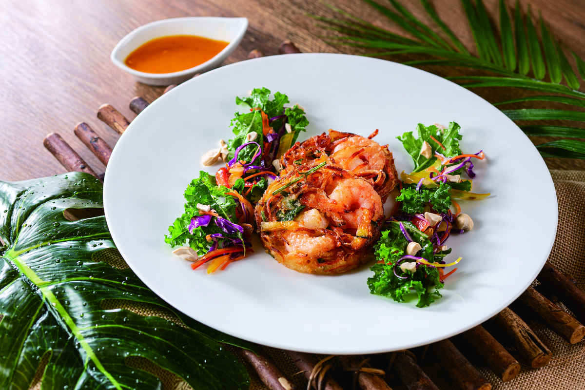 シュリンプかき揚げ“ウコイ”をマンゴー風味のチリソースで