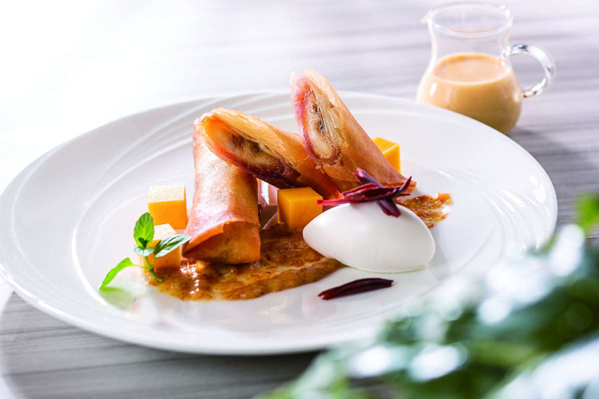 バナナと紫イモのジャムを薄い皮で巻いて揚げ、ココナッツのムースとバナナのソース、マンゴーを添え、シェイブしたフィリピンチョコレートをのせた温かいデザートです。
