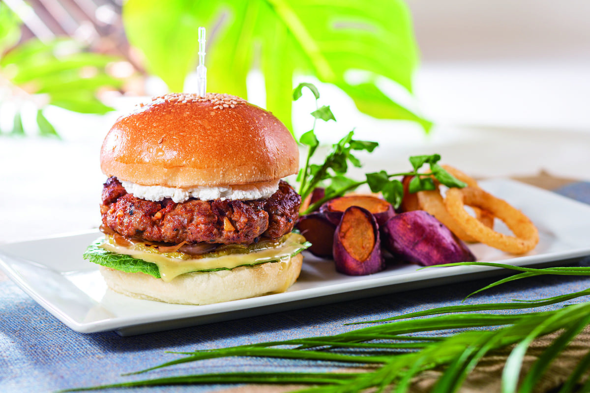 ジューシーでニンニクと胡椒が効いたビガン・ロンガニーサのパテを、クリーミーなカッテージチーズやパイナップルと重ねてバーガーに仕立てています。
