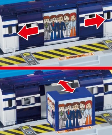 都市部と郊外を結ぶ通勤特急であるこの車両の中間車両には、セットに含まれる駅パーツを使ってお客さんを乗せ降ろし遊びができるギミックがあります。