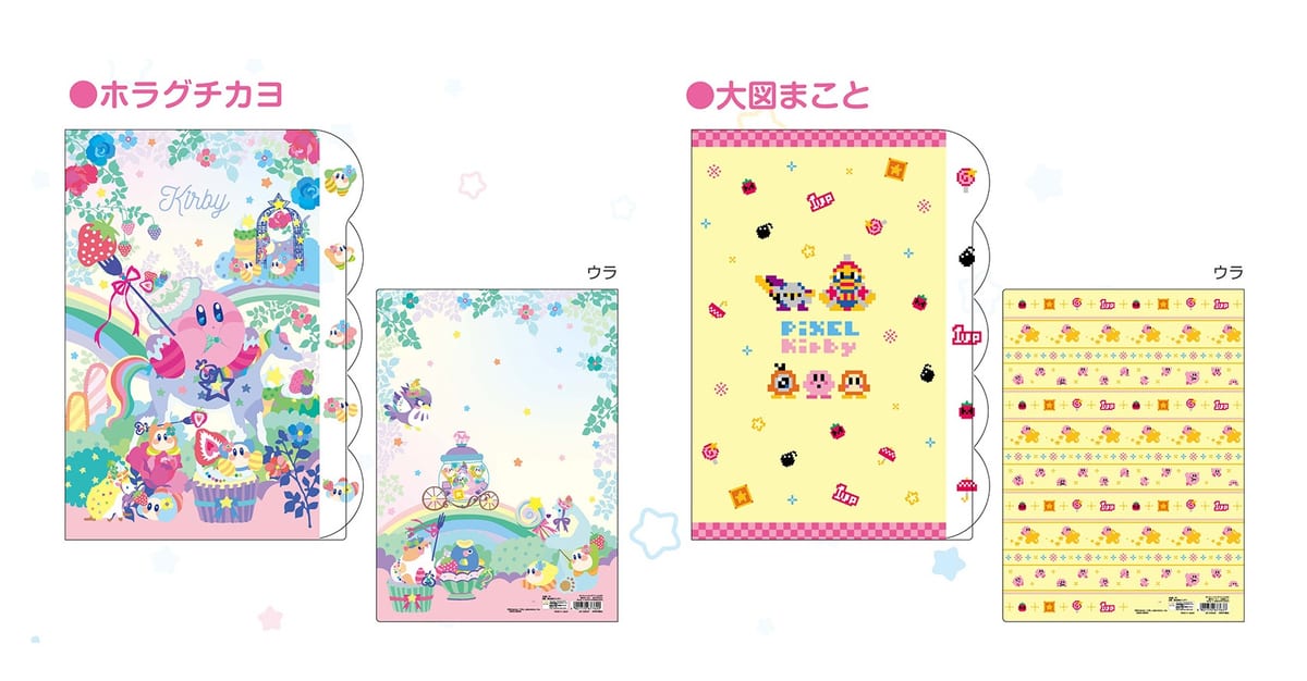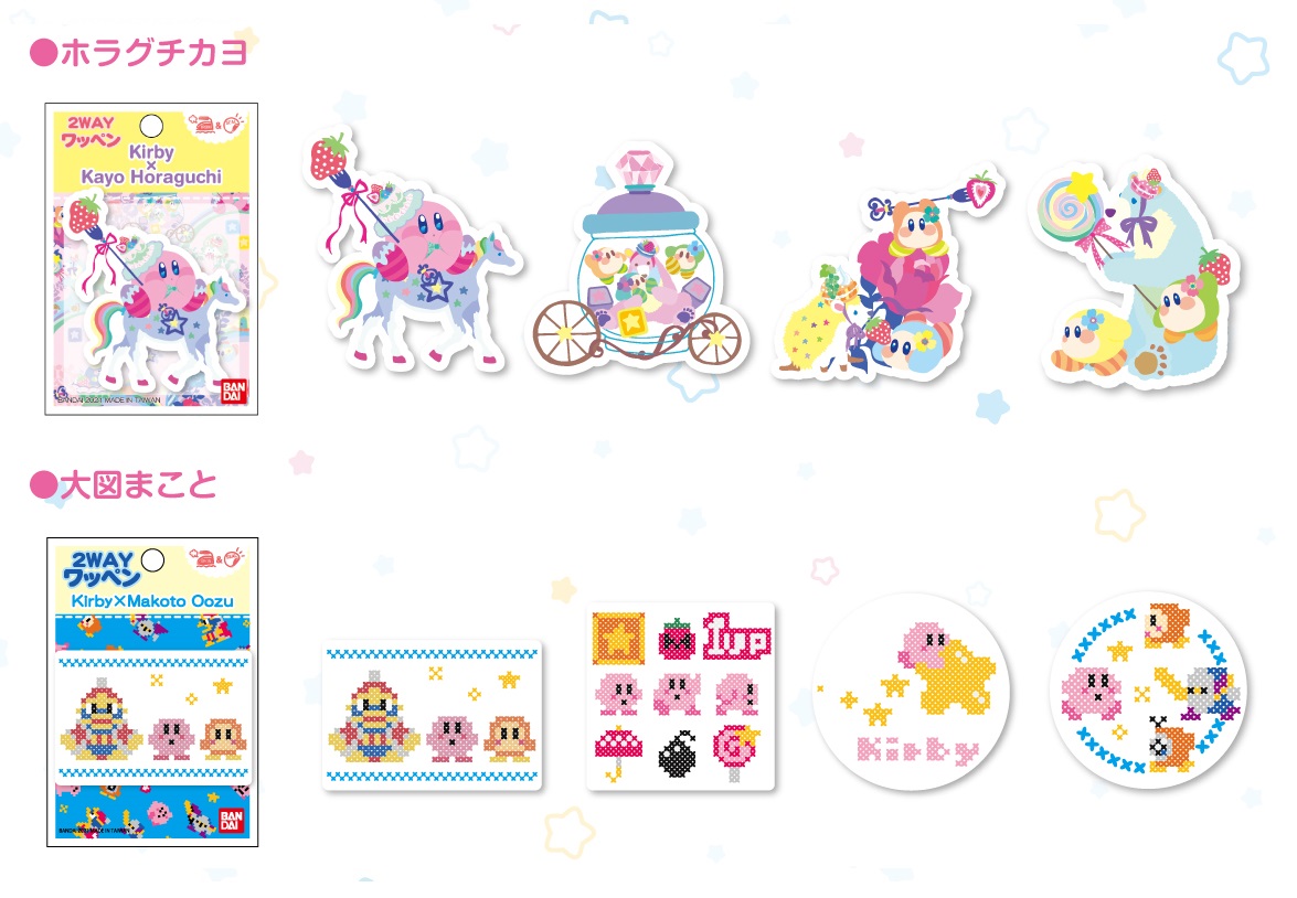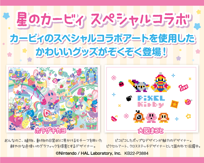 イラストレーター・ホラグチカヨさん、クロスステッチデザイナー・大図まことさんがそれぞれ描いた、スペシャルな「カービィ」アートが使用されています☆