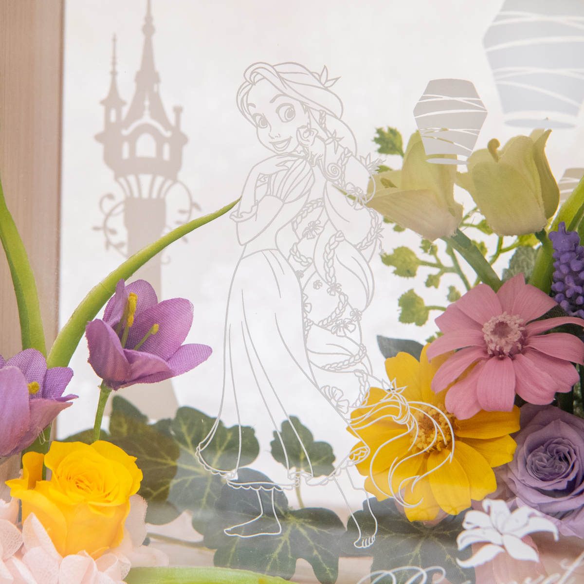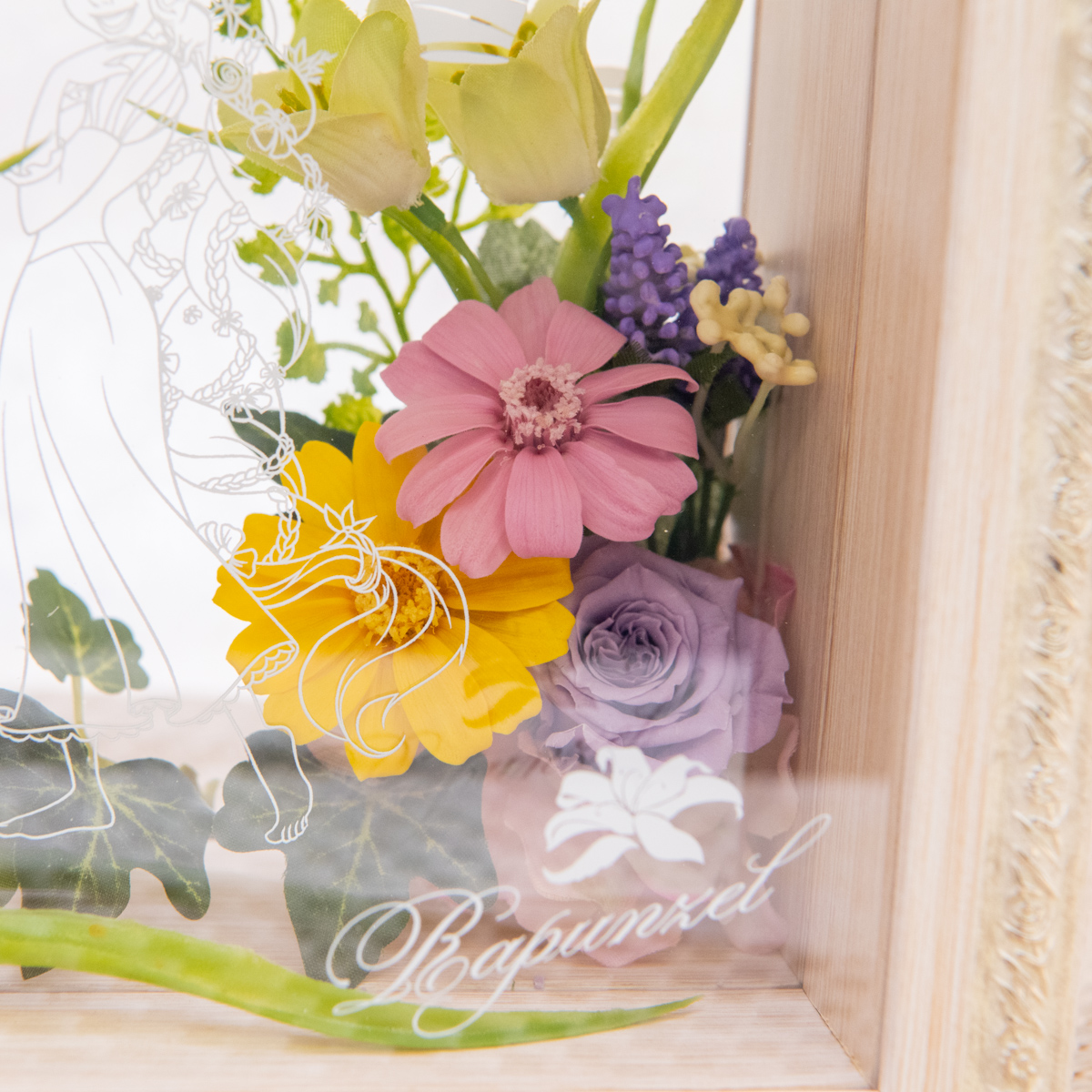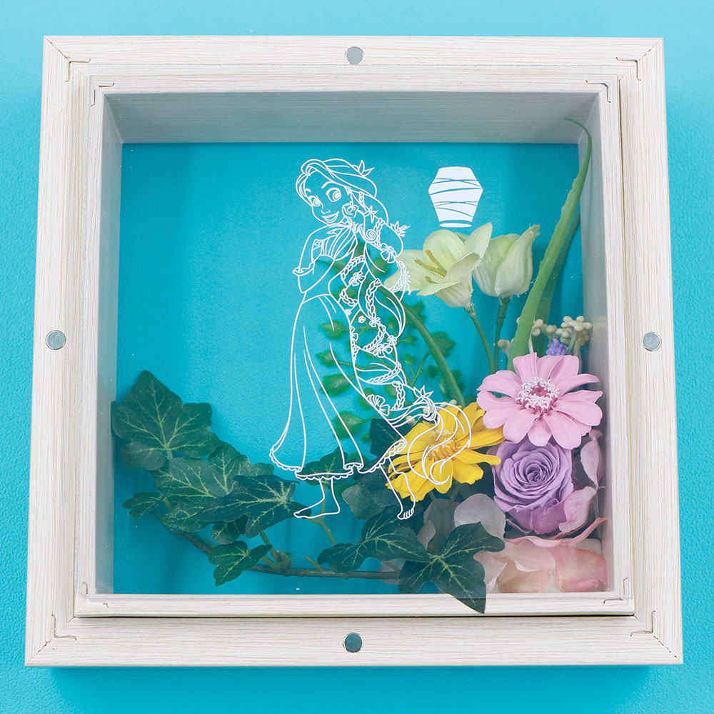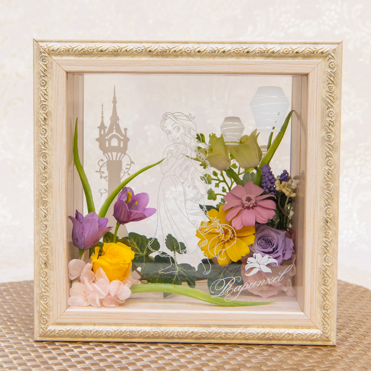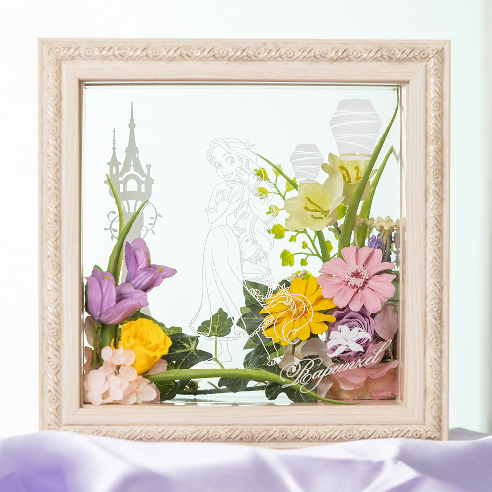 たくさんの花々に囲まれたラプンツェルをアクリルフレームで表現したフラワーギフトです☆