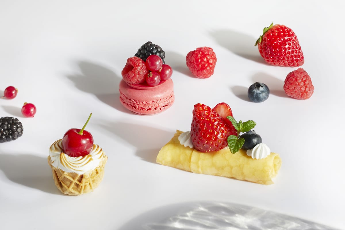 デザート「チェリー&ダークチョコレートのワッフルタルト/ベリーたっぷりのフルーツマカロン/苺とクレームダンジュのクレープ包み」