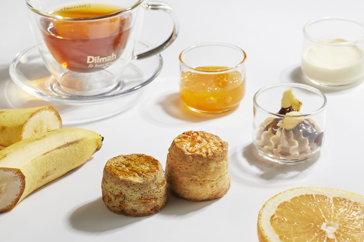 贅沢に練り込んだ芳醇なバターの香りとコクを味わえるプレーンと、ティーブランド「ディルマ」の「オリジナル・アールグレイ」を練り込んだ「オレンジとアールグレイスコーン」の2種類が提供されます。