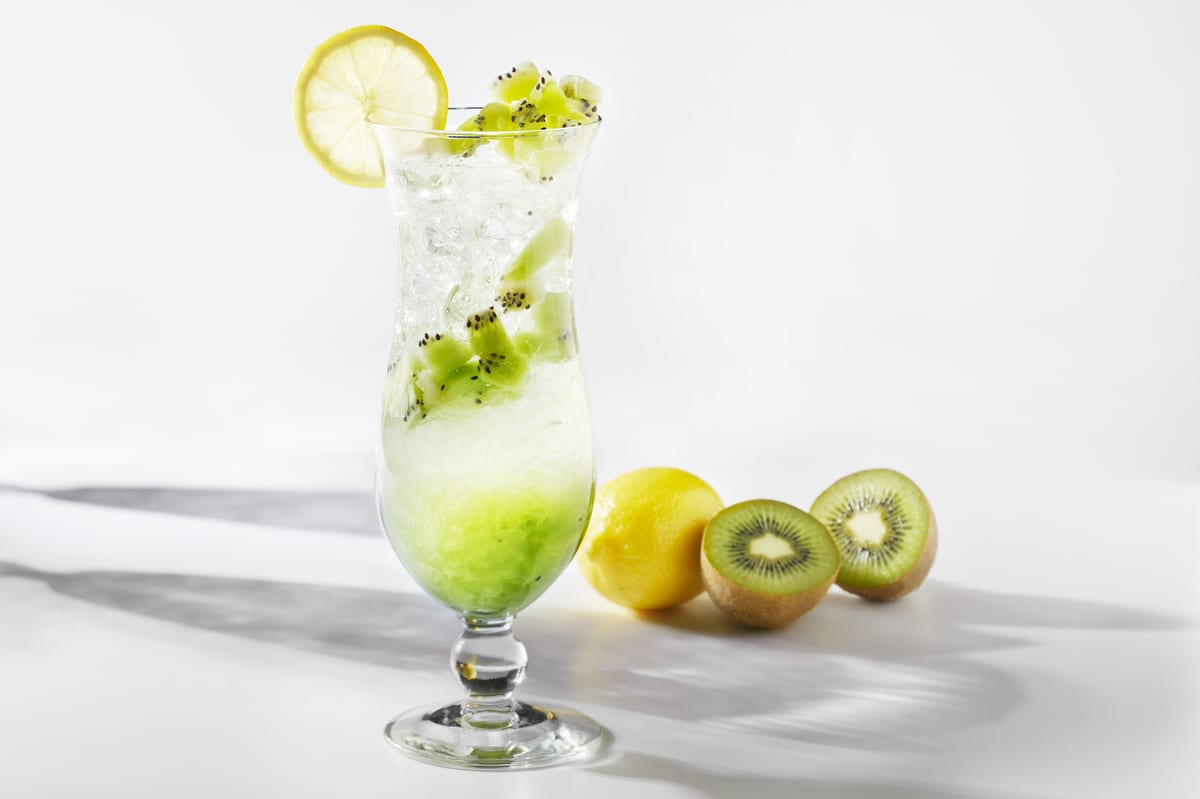 甘酸っぱいキウイのピューレに、ソーダとレモンジュースを合わせたモクテル。