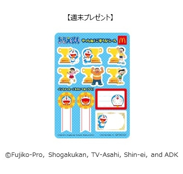 ハッピーセット「ドラえもんわくわくゲーム」を1セット購入につき「やったね!ごほうびシール」が1枚、プレゼントされます。