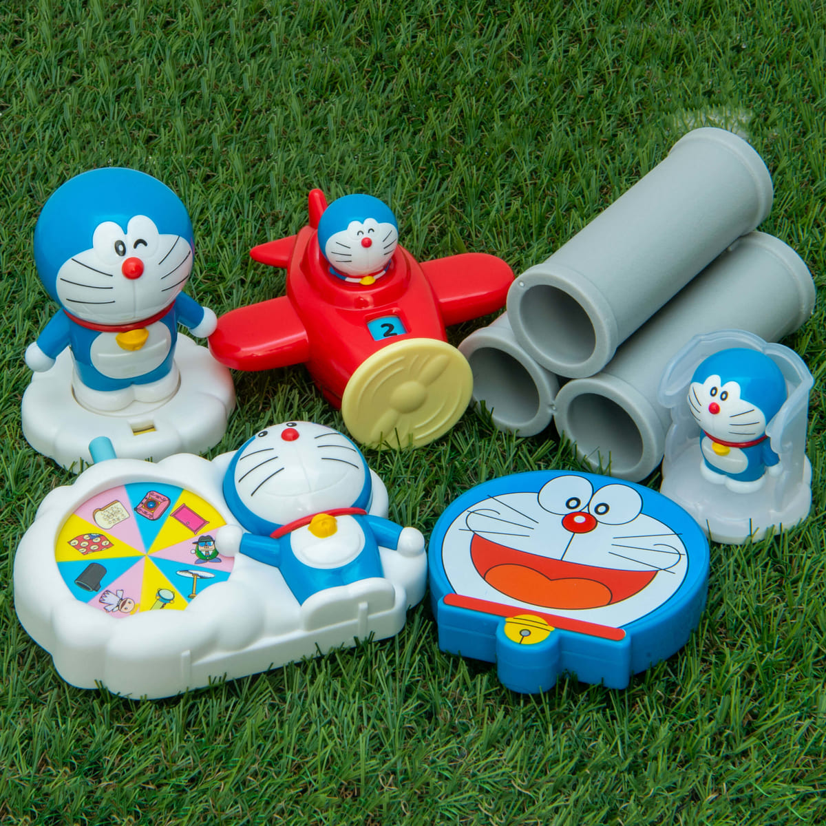 「ドラえもん」や「のび太」など人気のキヤラクターとともに、ひみつ道具を使うゲームなど、すべてハッピーセットのために開発されたおもちゃです。
