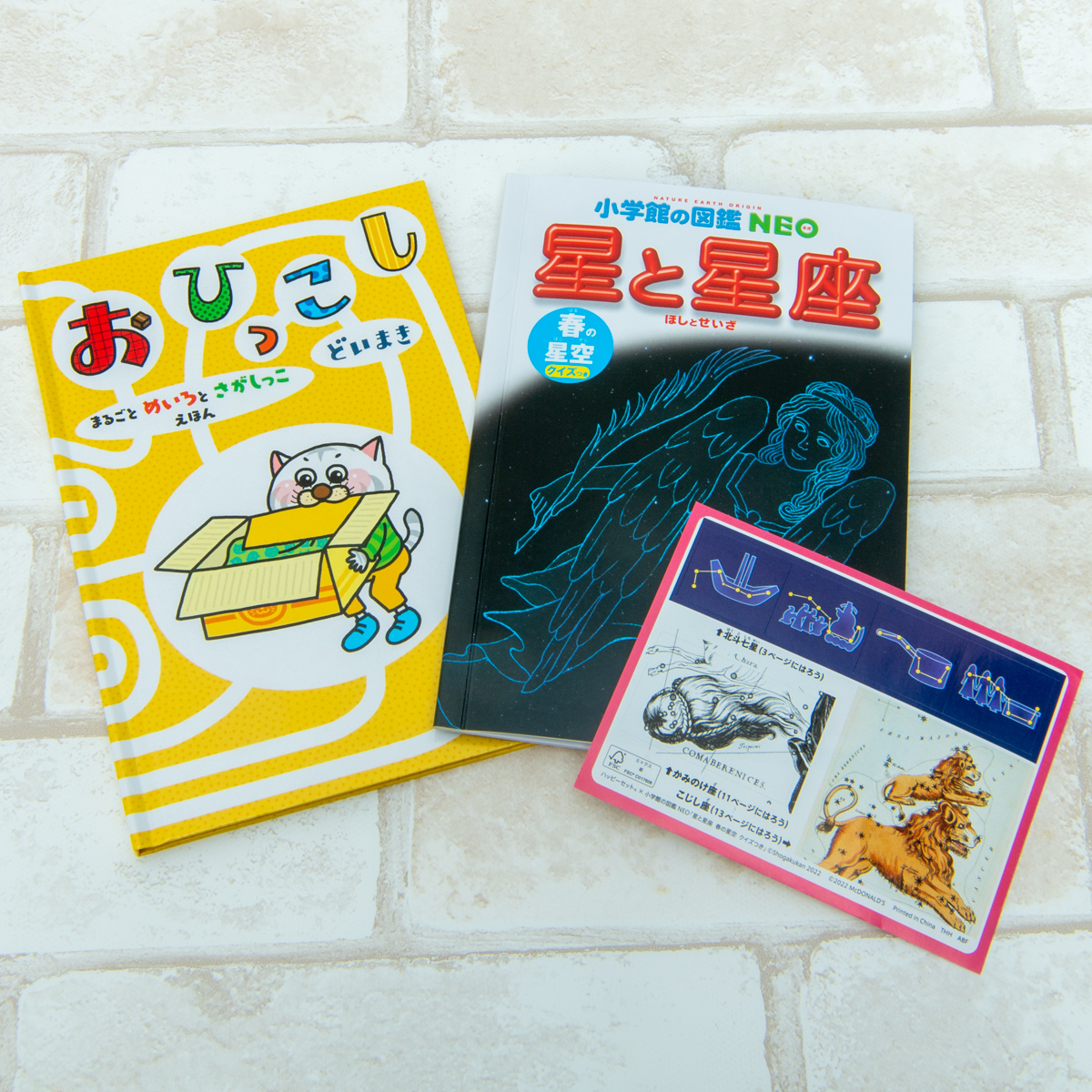 絵本「おひっこしまるとごめいろとさがしっこえほん」と、ミニ図鑑「星と星座/春の星空クイズつき」がラインナップされます☆