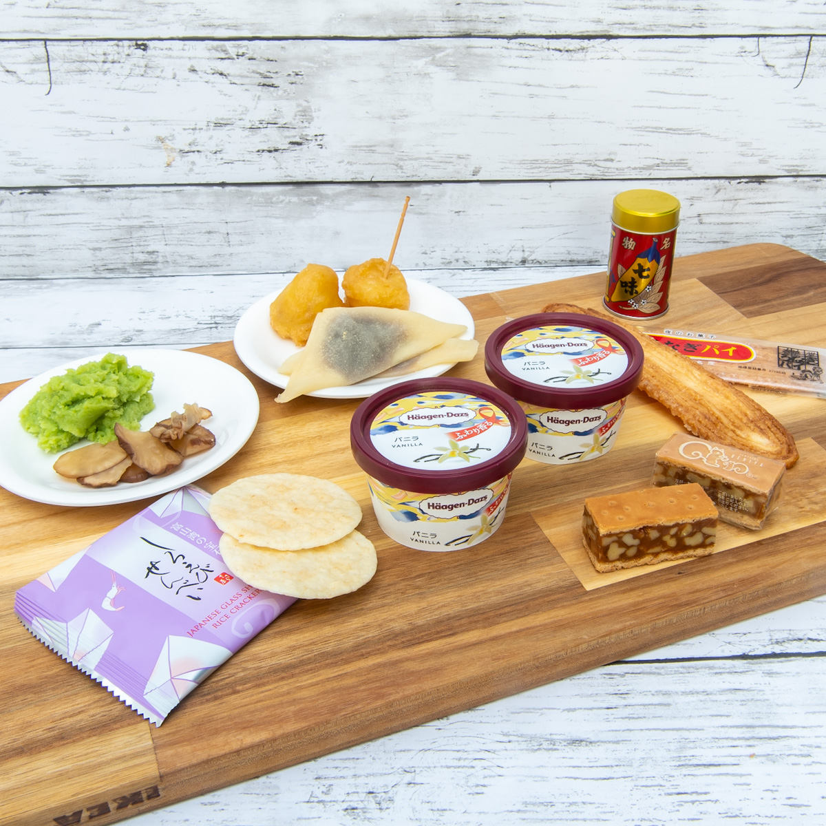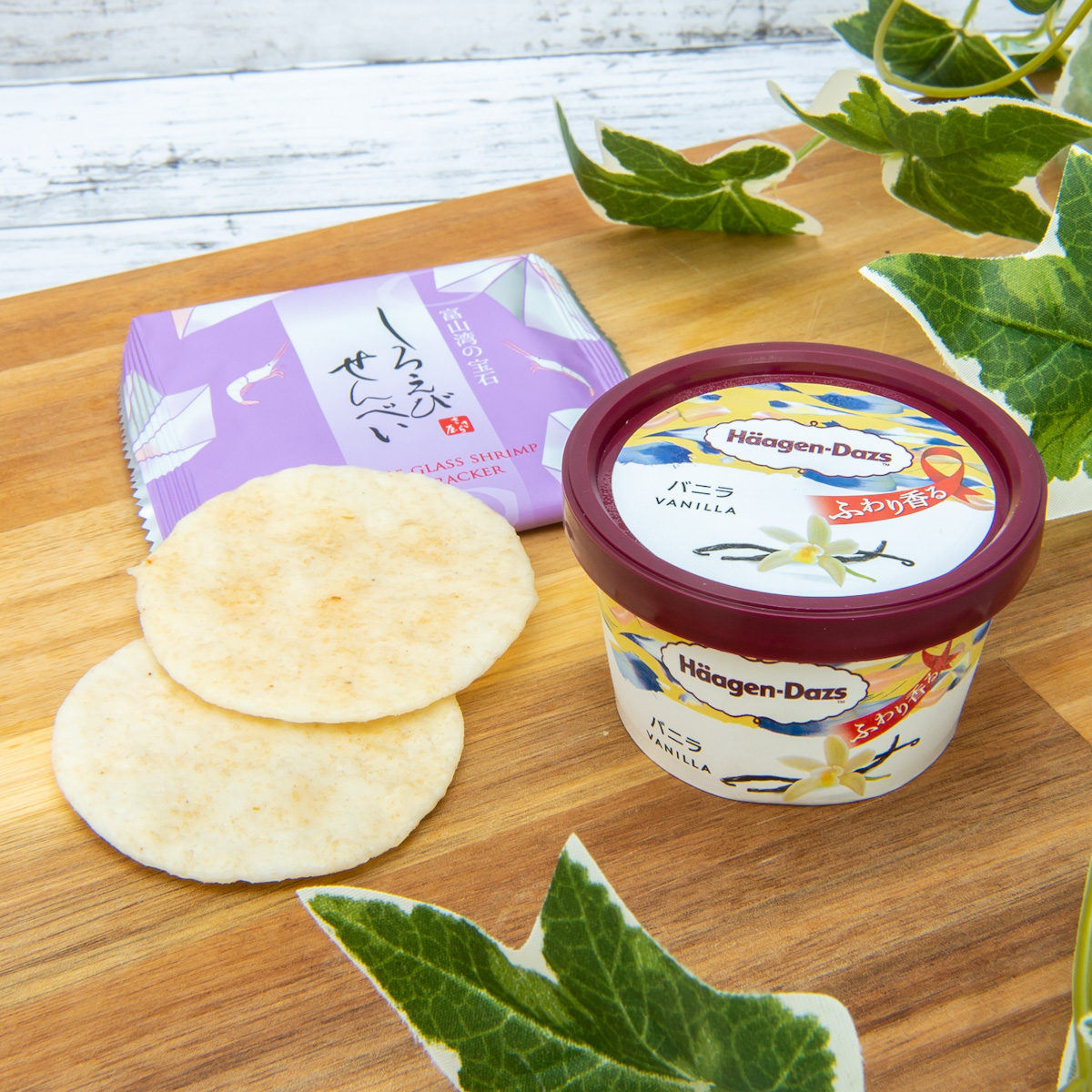 富山県の「しろえびせんべい(日の出や製菓産業)」と合わせると、しろえびの風味がアクセントになる、あまじょっぱいスイーツに。