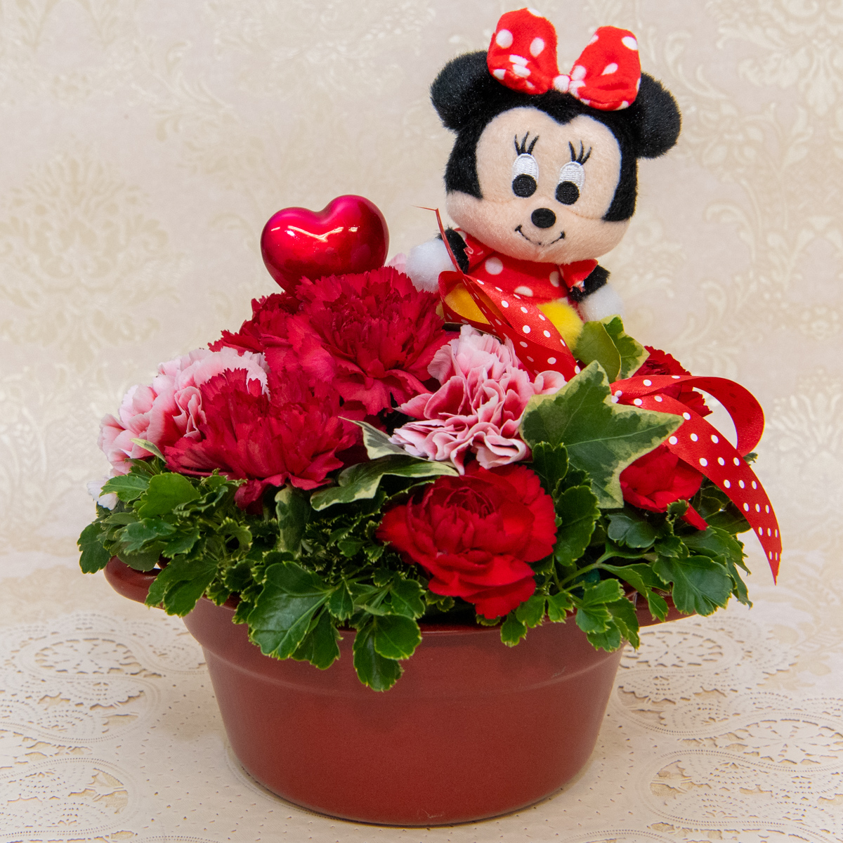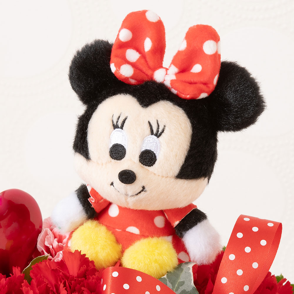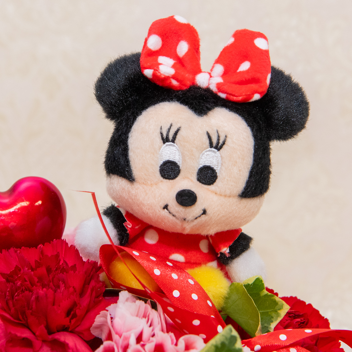 ぬいぐるみの「ミニーマウス」を中心に母の日の定番の赤いカーネーションでまとめたココロ踊るキュートなアレンジメント。