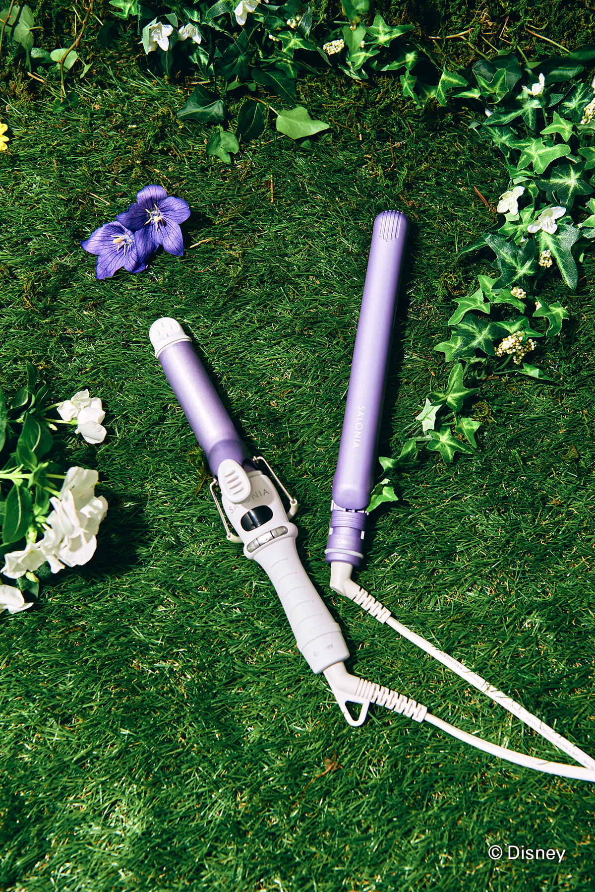 ディズニープリンセス「ラプンツェル」のイメージカラーであるラベンダーパープルをベースにした「ミニストレートヘアアイロン」と「ミニセラミックカールヘアアイロン 25mm 」が展開されます。