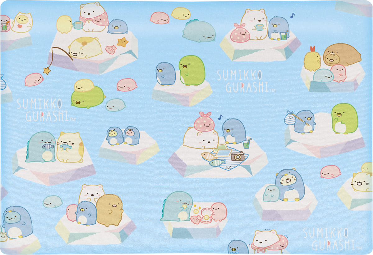 氷の上で思い思いに楽しむ「すみっコ」と「みにっコ」たちの、かわいいデザインの限定カバーです☆