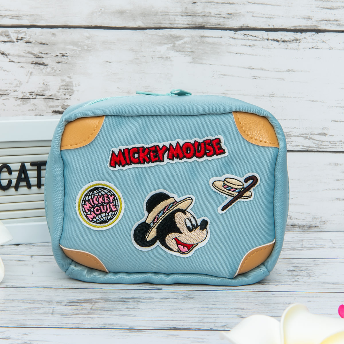「ミッキー&フレンズ」の顔や名前の刺繡ワッペンがついた、使いやすい大きさのトラベルポーチ。