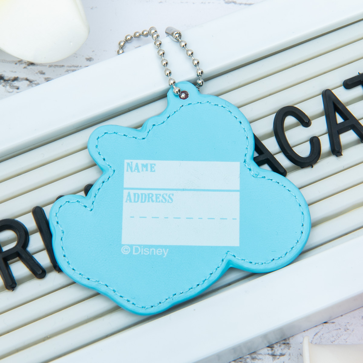 「ミッキー&フレンズ」の顔を大きくあしらったデザインの、裏面に名前などが書けるネームチャーム。