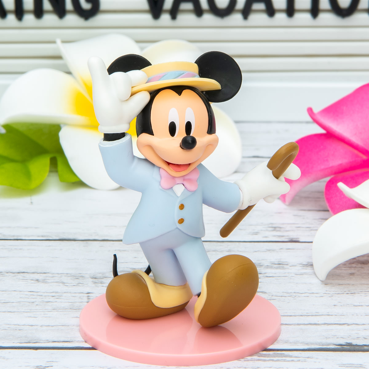 淡いブルーのスーツにステッキを持った、春らしい色合いの「ミッキーマウス」