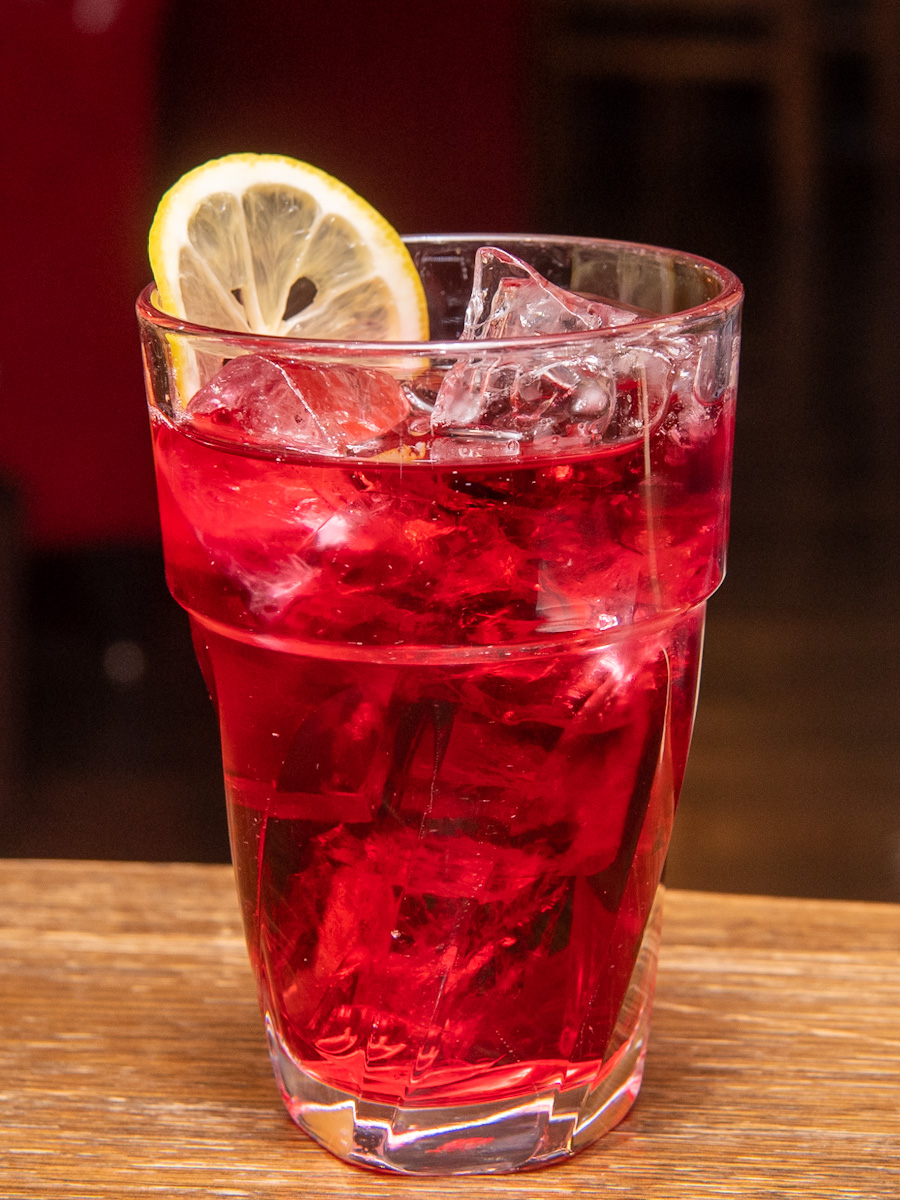 真っ赤に染まったクランベリージュースにレモンが添えられた見た目もおしゃれな一品です☆