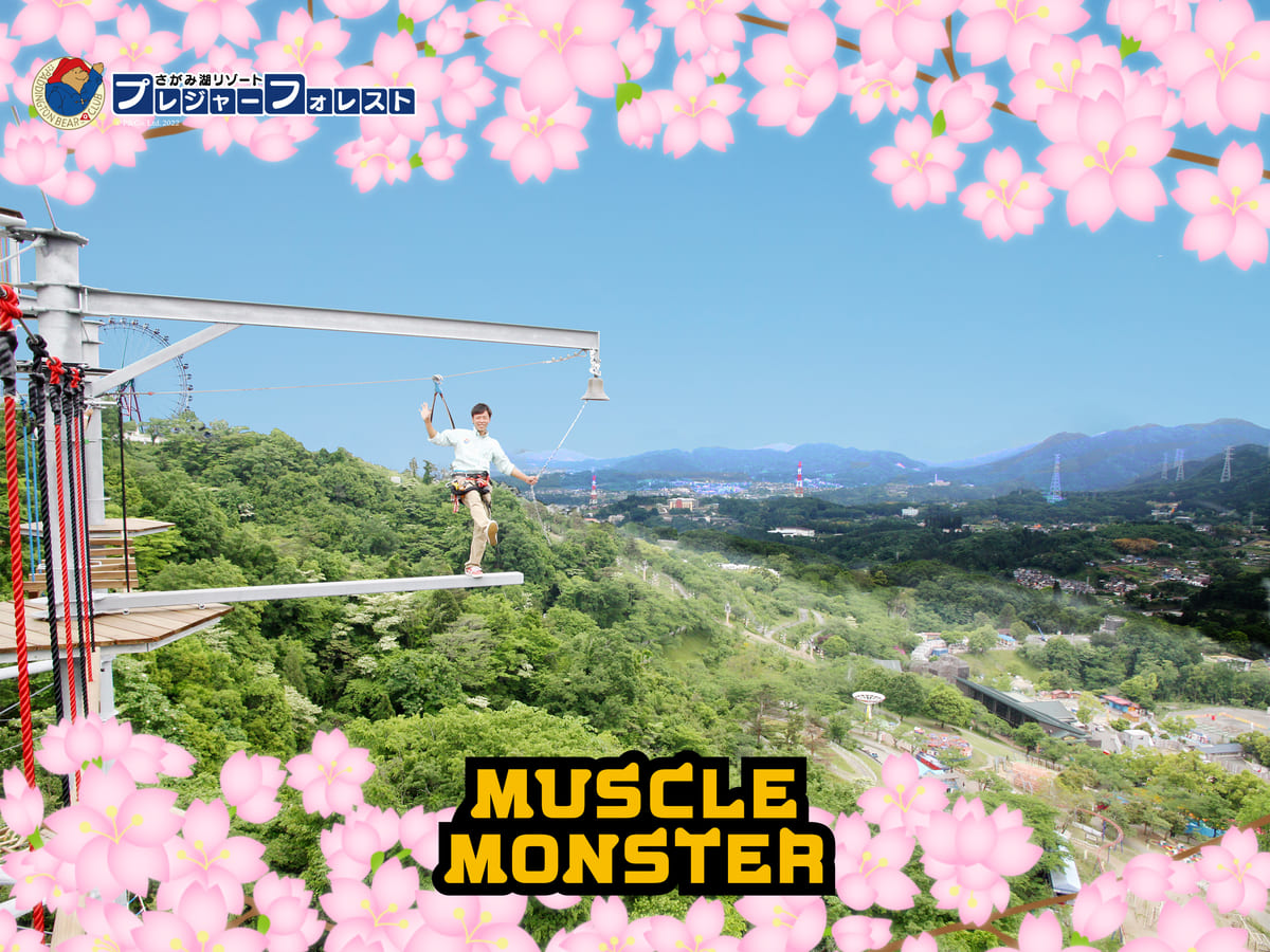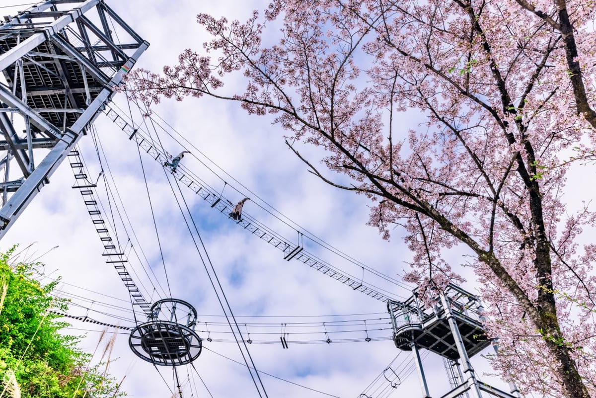 また、標高370mの園内山頂にそびえる絶叫吊り橋「風天」や巨大アスレチック「マッスルモンスター」から桜を見下ろす“お花見アスレチック”