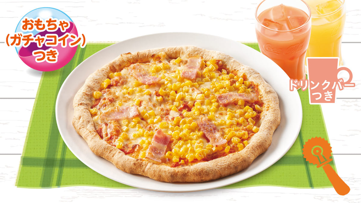 - ラッキージュニアセット たっぷりコーンとベーコンのピザ(ドリンクバー付き)799円(税抜)