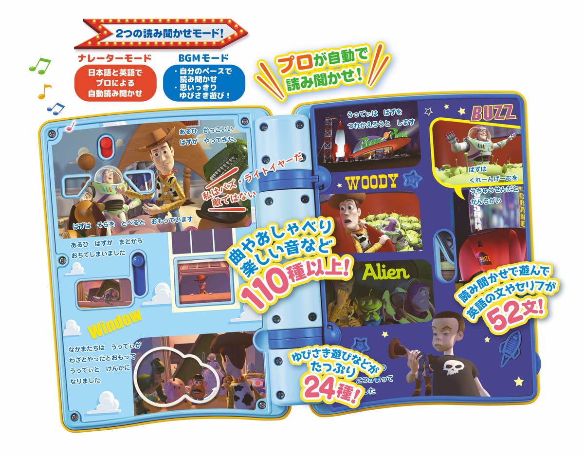 読み聞かせや音楽を聴き、絵本に触れて遊べる「トイ・ストーリー」の知育絵本。