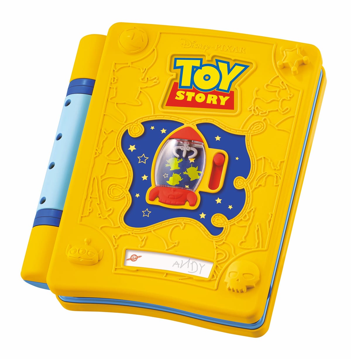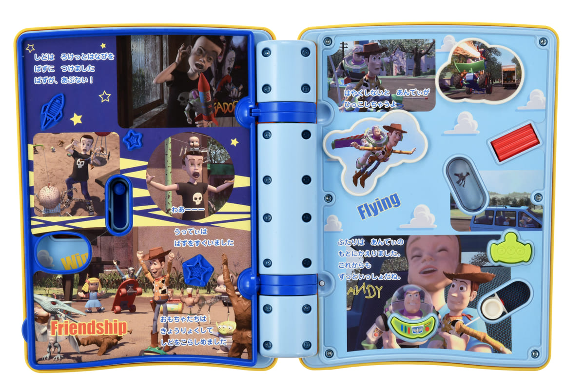 ページを開くと絵と文字で「トイ・ストーリー」の物語が描かれ、指先で触れながら遊べるボタンやレバーが登場。