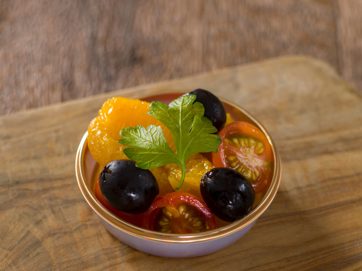 オリーヴ、ミニトマト、オレンジのマリネ