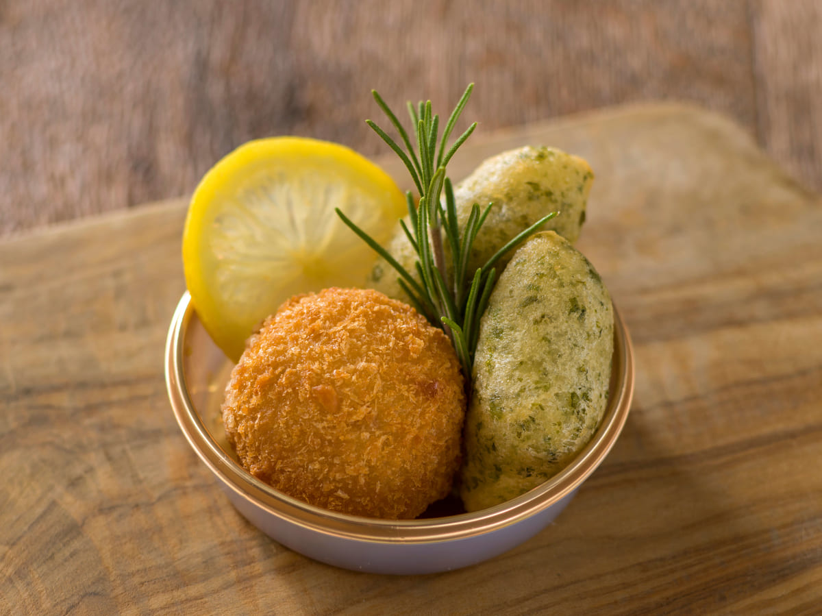 トリュフの香りが口の中でふわっと広がるクリームコロッケともちっとした食感のゼッポリーネをのせた一皿。