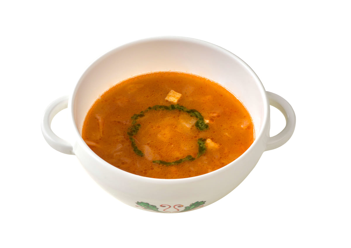 トマトのほのかな酸味がおいしい、具だくさんの野菜スープ。
