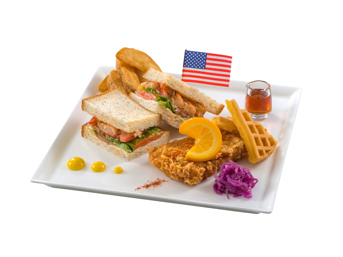 シュリンプとサーモントラウトのサンド、フライドチキン、ワッフル&メイプルシロップが盛り付けられた一皿。