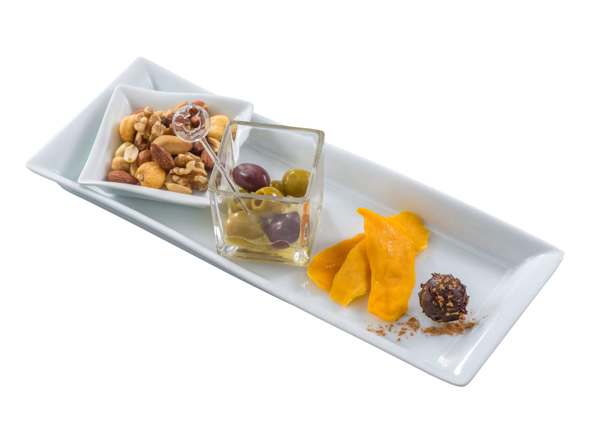 ミックスナッツ、オリーヴ、ドライマンゴー、チョコレートの盛り合わせ。