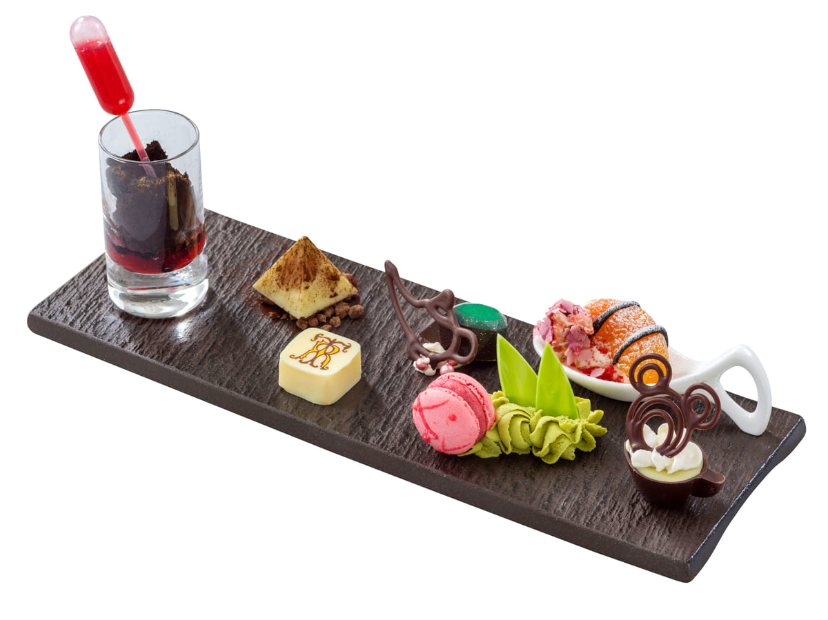 シフォンケーキ ストロベリーソース、チョコレート4種、アプリコット、マカロンが盛り付けられています。