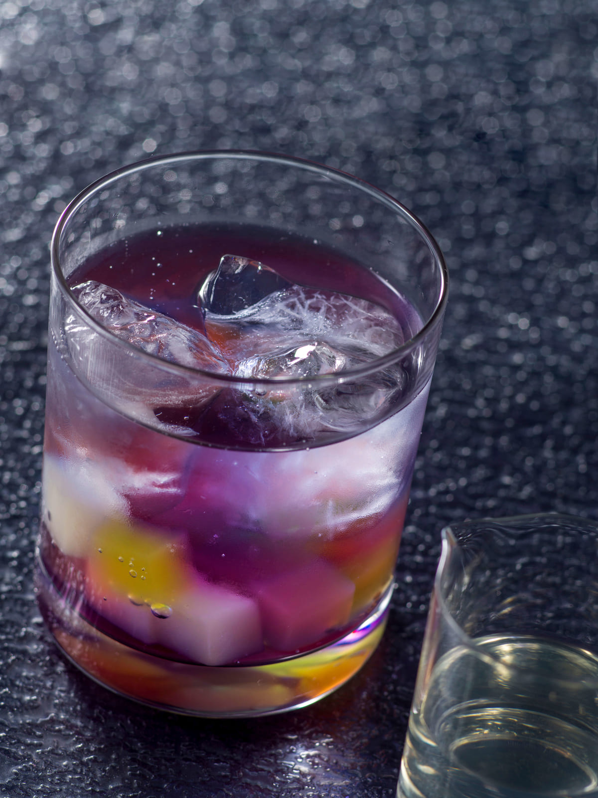 ライチーリキュール、マンゴスチンリキュール、レモンジュース、ソーダ、バタフライピーシロップを入れたカクテル。