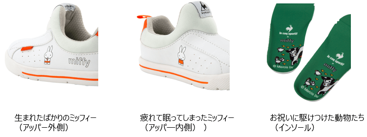 シューホールやサイドテープ、踵やステッチに至るまで、青・黄色・オレンジ・緑・白の「ブルーナカラー」を配色することで「ミッフィー」の世界観が表現されています。