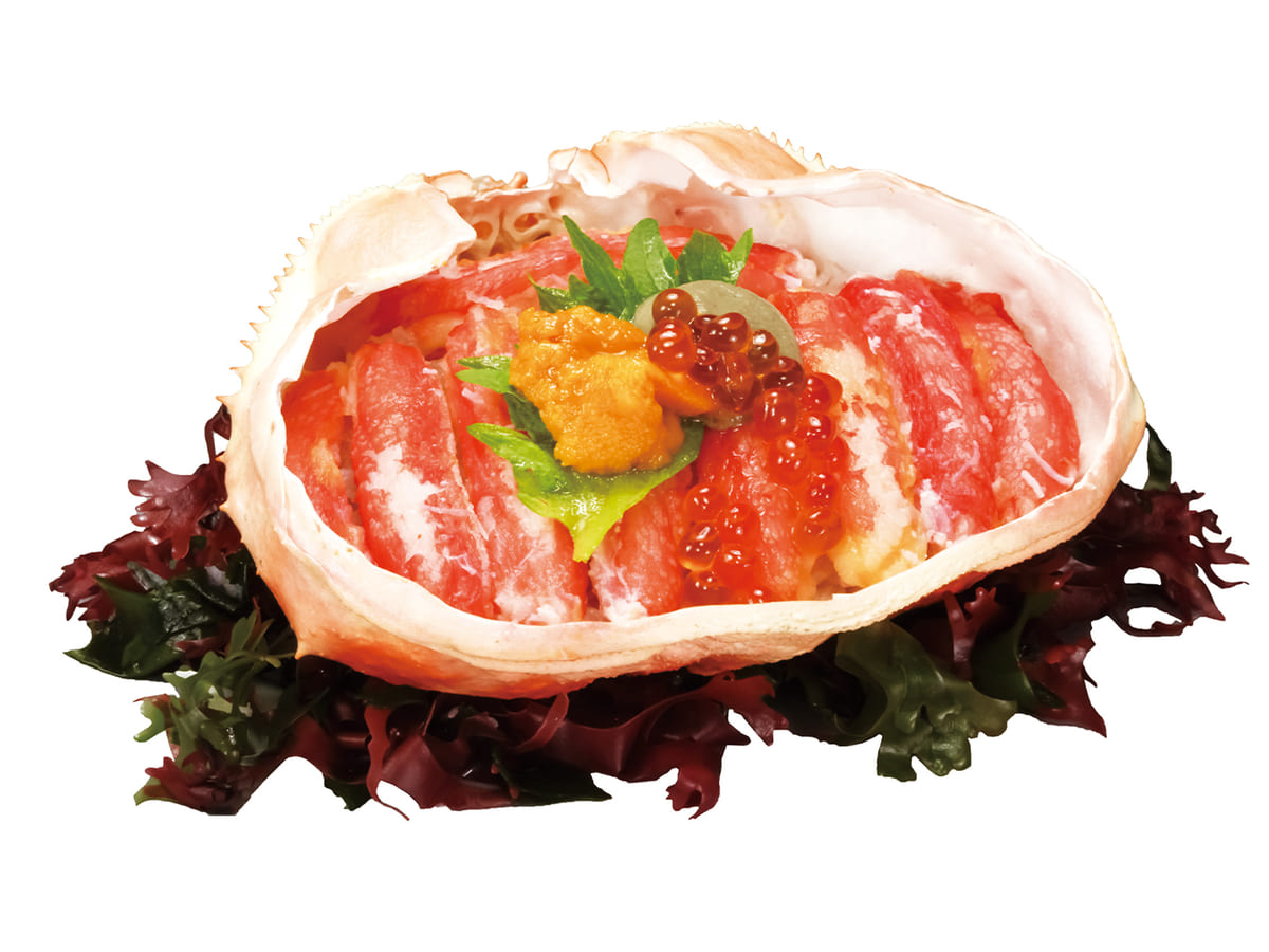 カニの甲羅に、シャリ、カニフレーク、カニ棒肉をふんだんに盛り付けた、カニ好きにはたまらない一品です。