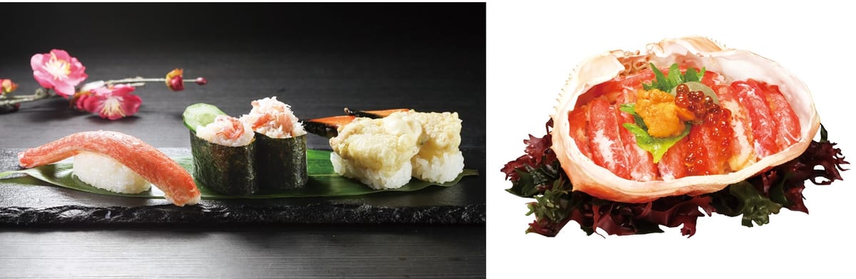 新商品の「極上かに玉手箱」や「ボイル本ズワイガニ(一貫)」「本ズワイガニ 二種盛り軍艦」「カニ爪天タルタル」などが味わえます☆