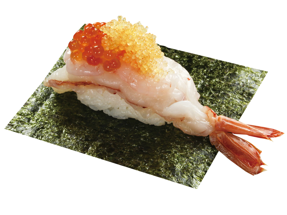 ぷりぷりの食感が楽しめる肉厚な赤えびに、いくらやとびこをふんだんにトッピングした一品。